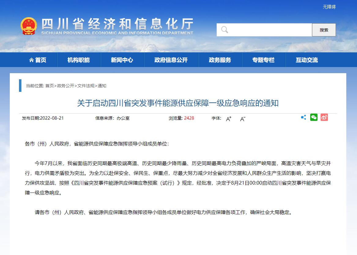 近期,因極端高溫天氣等原因,四川工業(yè)企業(yè)“臨時限電通產(chǎn)”引發(fā)行業(yè)高度重視。此前,相關(guān)部門下發(fā)通知,將限電停電期定為8月15日至20日。不過由于高溫天氣并未得到明顯好轉(zhuǎn),電力供需緊張形勢進一步加劇,8月20日四川經(jīng)信廳、國網(wǎng)四川電力公司發(fā)布的一份《關(guān)于擴大工業(yè)企業(yè)讓電于民實施范圍的緊急通知》,將限電期限延長至25日,使得限電總時長延長到11天.