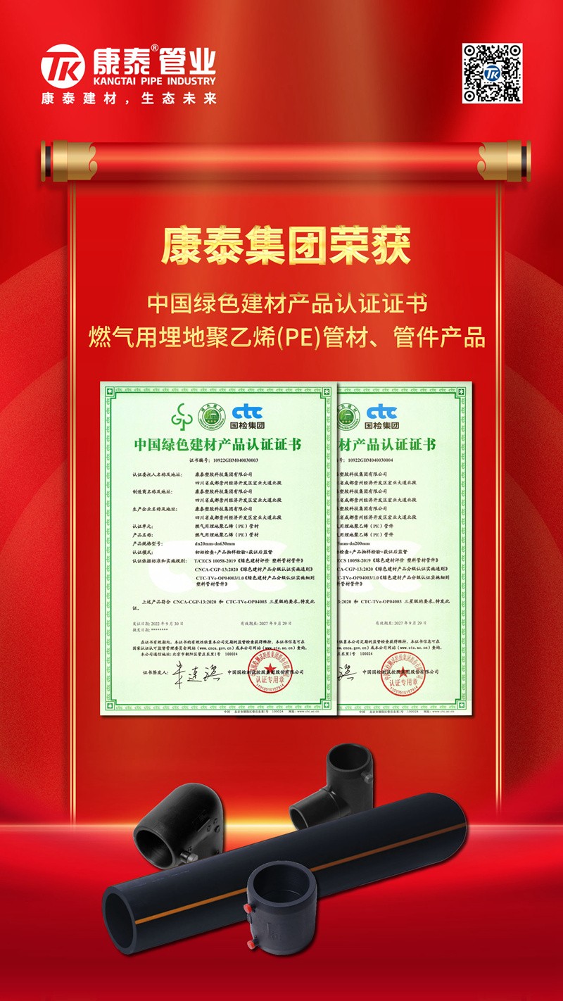 近日,康泰塑膠的給水用聚乙烯(PE)管材、管件產(chǎn)品,燃?xì)庥寐竦鼐垡蚁?PE)管材、管件產(chǎn)品,冷熱水用聚丙烯(PPR)管材、管件產(chǎn)品,埋地用聚乙烯(PE)雙壁波紋管材產(chǎn)品,冷熱水用耐熱聚乙烯(PE-RT)管材產(chǎn)品,給水用鋼絲網(wǎng)增強(qiáng)聚乙烯復(fù)合管材產(chǎn)品順利中國(guó)國(guó)檢測(cè)試控股集團(tuán)股份有限公司認(rèn)證審核,獲得中國(guó)綠色產(chǎn)品認(rèn)證證書。充分展現(xiàn)了康泰塑膠獲證產(chǎn)品在多種綠色屬性和考核指標(biāo)的硬核實(shí)力。