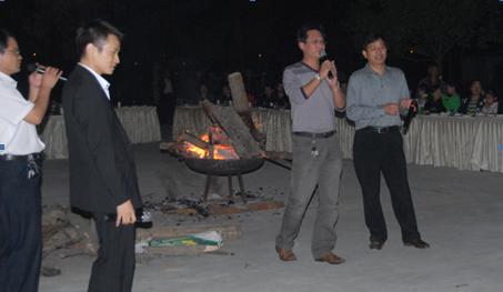晚宴后,大家紛紛來到戶外,圍著篝火舉杯歡唱,在主持人幽默詼諧的帶領(lǐng)下,參與互動的員工熱情高昂?;顒右恢背掷m(xù)到晚上10點(diǎn),大家仍然意猶未盡。