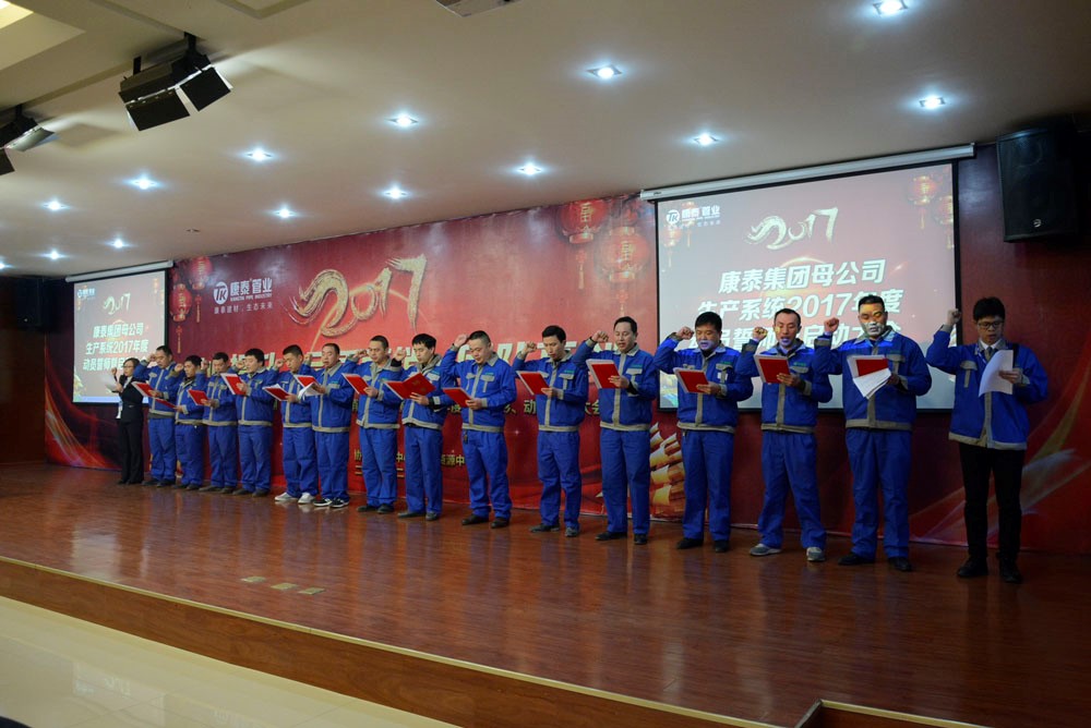 ? ? ? ?為清晰傳遞公司發(fā)展戰(zhàn)略,有效提升產(chǎn)品配套齊全、性價(jià)比優(yōu)、質(zhì)量穩(wěn)定受控的生產(chǎn)后勤保障優(yōu)勢(shì),2月22日下午,由生產(chǎn)中心主辦,人力資源中心、市場(chǎng)中心協(xié)辦的“康泰集團(tuán)2017年度生產(chǎn)系統(tǒng)保障動(dòng)員誓師大會(huì)”在集團(tuán)總部召開(kāi)??堤┘瘓F(tuán)董事長(zhǎng)兼總裁林云青,以及集團(tuán)副總裁、各中心總監(jiān)和中層以上干部、車間班組長(zhǎng)、車間員工代表等100多人參加會(huì)議。