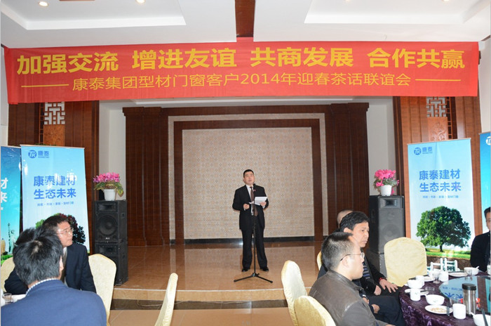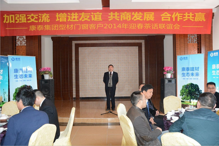 ??? 當(dāng)日,以“加強(qiáng)交流、增進(jìn)友誼、共商發(fā)展、合作共贏”康泰集團(tuán)型材門窗客戶2014年迎春茶話聯(lián)誼會(huì)在美麗的街子古鎮(zhèn)味江味花園飯店隆重召開,一百多名客戶參加了此次聯(lián)誼會(huì),集團(tuán)公司林總裁、品牌總監(jiān)鄭光鏵、型材事業(yè)部總經(jīng)理陳彪出席本次聯(lián)誼會(huì)。