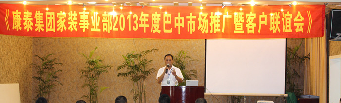??? 16日下午,“康泰集團(tuán)家裝事業(yè)部2013年度巴中市場(chǎng)推廣暨客戶聯(lián)誼會(huì)”在琴鶴苑召開(kāi)。會(huì)議上,營(yíng)銷中心總監(jiān)何朝暉向經(jīng)銷商們介紹了公司品牌營(yíng)銷的戰(zhàn)略規(guī)劃。公司重視規(guī)模,通過(guò)品牌策劃拓展終端市場(chǎng)的各種政策與支持堅(jiān)定了商家們與康泰共同發(fā)展的信心和決心。