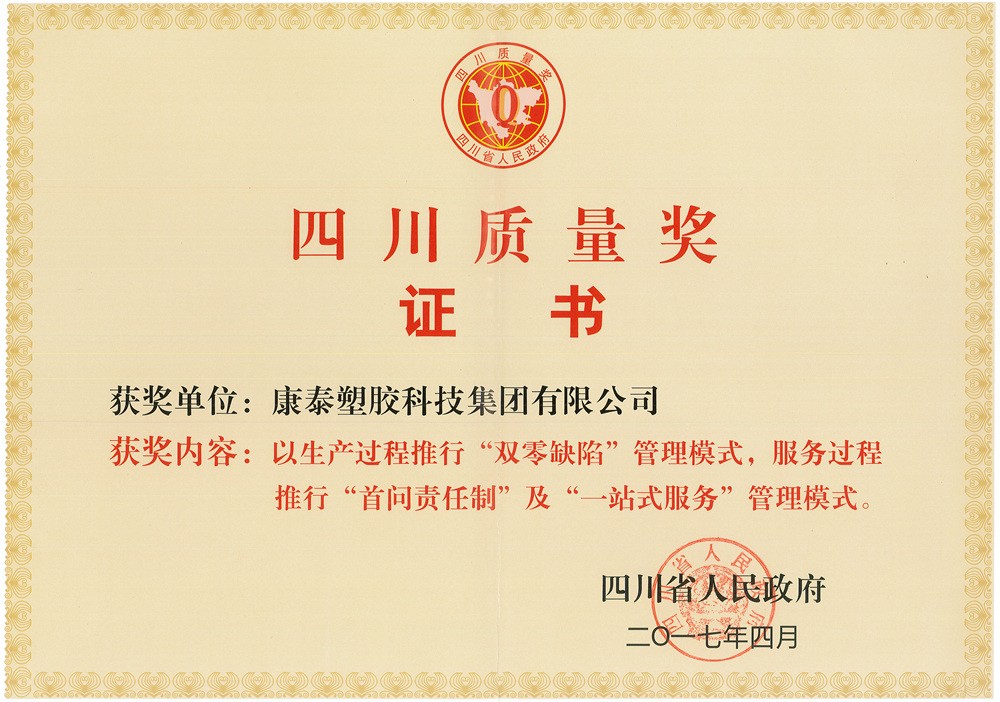 三是質(zhì)量強企,獲得第四屆四川質(zhì)量獎??堤┘瘓F以“圍繞全球顧客、不斷改善,追求產(chǎn)品零缺陷”的質(zhì)量方針,貫徹“產(chǎn)品如人品”的質(zhì)量理念,全面覆蓋ISO9001、ISO14001、OHSAS18001三體系,實施全員、全面質(zhì)量管理,通過導(dǎo)入PDCA循環(huán)管理和QCC體系,嚴格質(zhì)檢把控,確保從原料進廠到產(chǎn)品出廠的優(yōu)質(zhì)質(zhì)量保障??堤┫群髽s獲全國質(zhì)量誠信標(biāo)桿典型企業(yè)、全國質(zhì)量檢驗穩(wěn)定合格產(chǎn)品、全國百佳質(zhì)量誠信標(biāo)桿示范企業(yè)等榮譽稱號。2017年,憑借“生產(chǎn)過程推行‘雙零缺陷’管理模式,即供應(yīng)鏈來料100%合格進廠、產(chǎn)品質(zhì)量100%合格出廠,始終貫徹執(zhí)行態(tài)度零容忍、質(zhì)量零缺陷的‘雙零缺陷’管理模式”??堤┘瘓F從全省眾多優(yōu)秀企業(yè)中脫穎而出,成為唯一獲得第四屆“四川質(zhì)量獎”的塑膠建材企業(yè)。