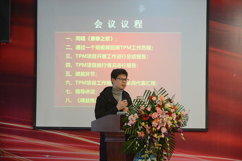 會議首先通過視頻回顧了TPM項目的導入、實施、改善,并對成果進行了展示。隨后,TPM項目組組長、生產(chǎn)副總監(jiān)李志堅作了《TPM項目開展工作進行總結(jié)匯報》。為了提升康泰集團在塑膠行業(yè)的競爭力,滿足客戶日益多樣化的需求,2017年9月28日,康泰集團導入了TPM——全面生產(chǎn)管理體系,圍繞TPM的自主維護、專業(yè)維護、現(xiàn)場改善及可視化等開展活動。通過活動的開展,生產(chǎn)系統(tǒng)各級對于TPM有了深刻的認識,車間員工學到了知識,提升了技能,對設備的傳統(tǒng)觀念有了轉(zhuǎn)變。截止2019年1月,現(xiàn)場發(fā)現(xiàn)問題7035項,整改6590項,整改率98% 。建立集團設備預防性維修保養(yǎng)體系,形成階段性標準化文件8份,設備故障率下降30% 。