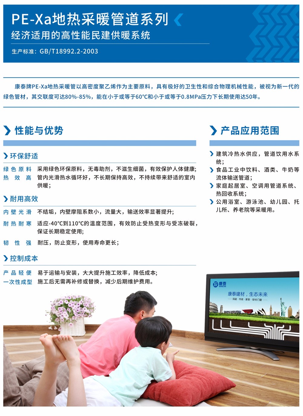 PE-Xa地?zé)岵膳苡捎诰哂泻芎玫男l(wèi)生性和綜合物理機械性能,被視為新一代的綠色管材,在西方發(fā)達(dá)國家,如英國、德國、日本等,自八十年代起,將PE-Xa地?zé)岵膳苡糜诎嬘盟蜔崴趦?nèi)的各類流體輸送管道,這些國家還制定了這類管材的國家標(biāo)準(zhǔn),以規(guī)范管材的設(shè)計、生產(chǎn)和安裝?,F(xiàn)在PE-Xa地?zé)岵膳苷谖鞣絿依^續(xù)得到廣泛的應(yīng)用。 康泰牌PE-Xa地?zé)岵膳芤愿呙芏染垡蚁┳鳛橹饕?,通過過氧化物交聯(lián)改性,將線型大分子結(jié)構(gòu)轉(zhuǎn)變?yōu)榭臻g網(wǎng)狀結(jié)構(gòu),生產(chǎn)出的PE-Xa地?zé)岵膳芙宦?lián)度可達(dá)80%-85%,可以在小于或等于60度和小于或等于0.8MPa壓力下長期使用壽命達(dá)50年。