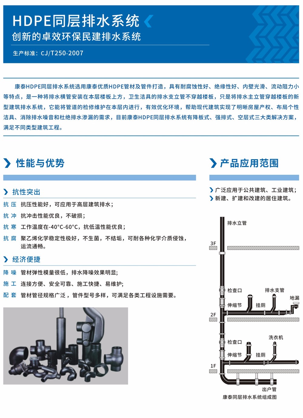 集團(tuán)研發(fā)的HDPE同城排水系列產(chǎn)品,選用選優(yōu)質(zhì)管材及管件打造,具有密度小、重量輕、韌性好、綠色環(huán)保、耐腐蝕、耐老化、絕緣性好、內(nèi)壁光滑、流動(dòng)阻力小、安裝快捷方便等特點(diǎn)。根據(jù)目前各類用戶的不同條件的需求,康泰HDPE同層排水系統(tǒng)有三種安裝方案,分別是降板式、墻排式、墊層式,既降低了土建成本,增加了整體凈空高度;又達(dá)到了衛(wèi)生、美觀、整潔的要求。