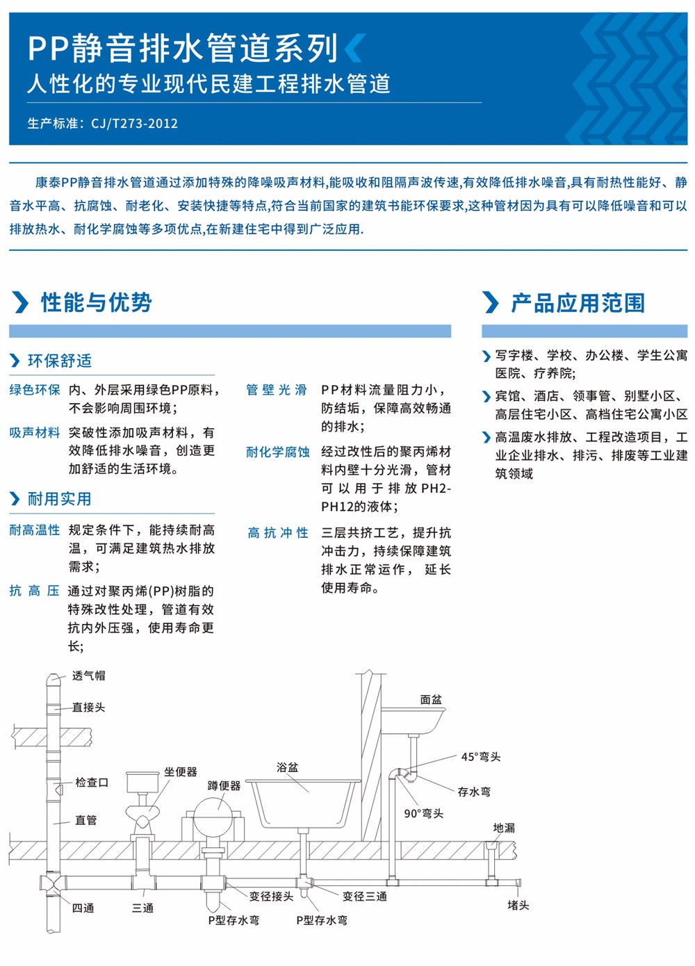 康泰牌聚丙烯靜音耐熱排水管道系統(tǒng)具有耐熱性能好、靜音水平高、抗腐蝕、耐老化、安裝快捷等特點,既可解決普通水管不能長期排放熱水的難題,又能有效的解決建筑內管道噪音的困擾,符合當前國家的建筑節(jié)能環(huán)保要求。這種管材因為具有可以降低噪音和可以排放熱水、耐化學腐蝕等多項優(yōu)點,在新建住宅中得到廣泛應用。